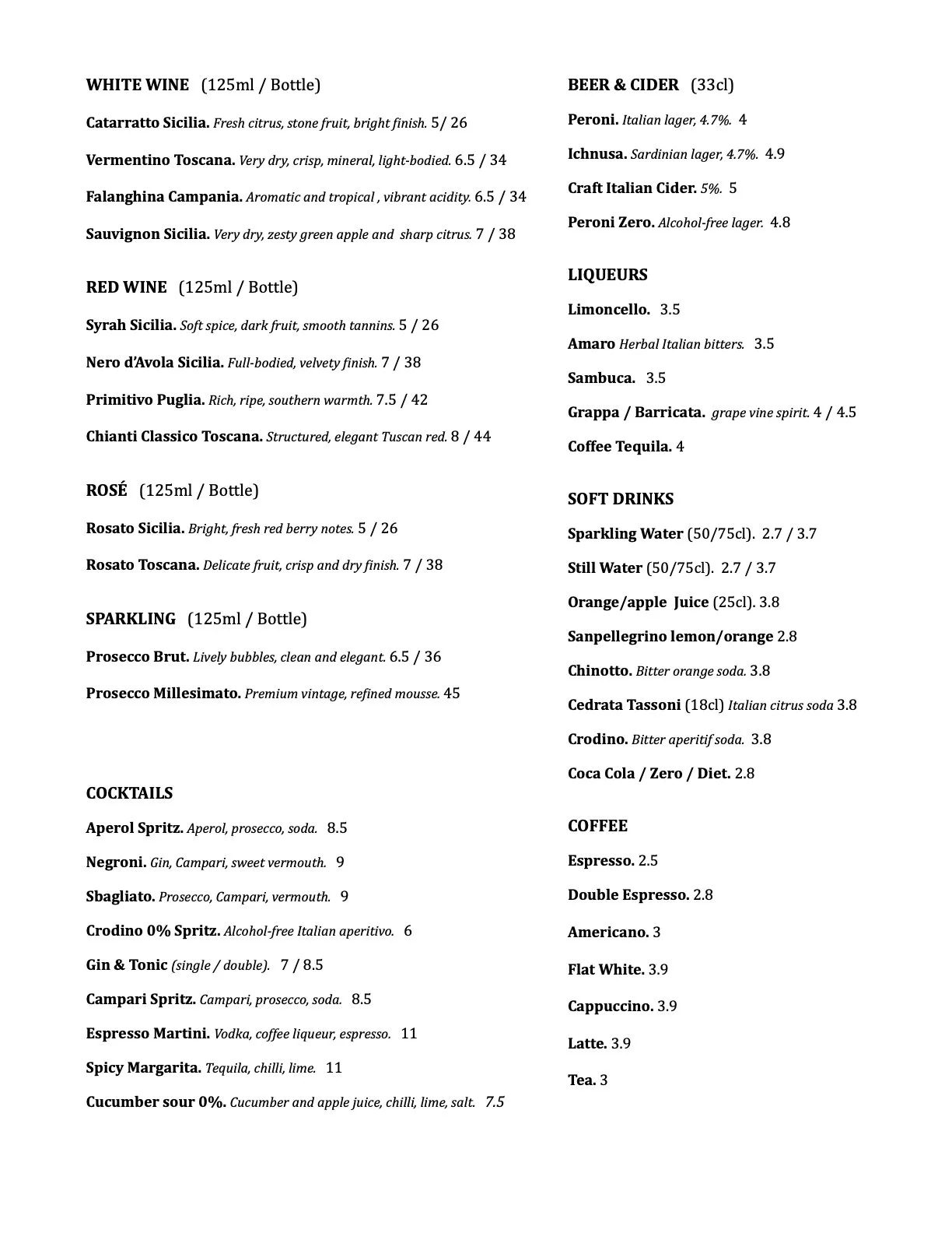 drinks menu and WINE list